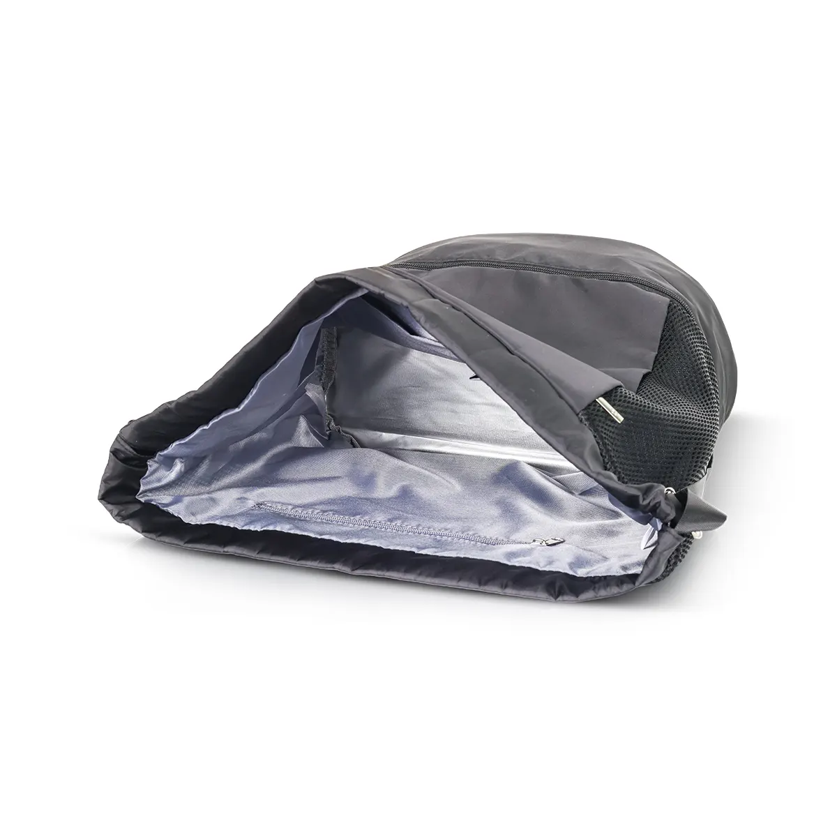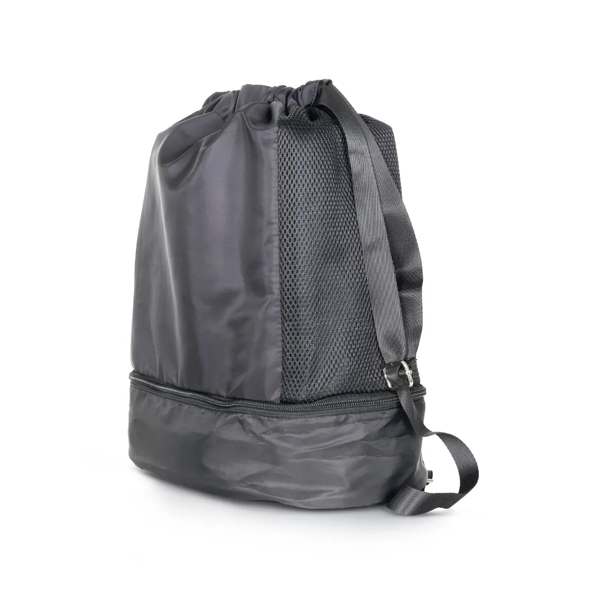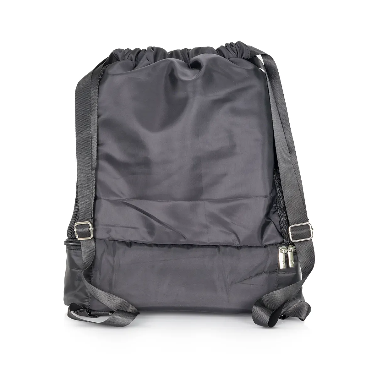 Made from durable, water-resistant fabric with mesh side panels for added ventilation, it’s perfect for gym sessions, travel, exhibitions, or promotional events. The minimalist black finish offers a professional look, making it suitable for branding with your company logo or event theme through screen printing or embroidery.