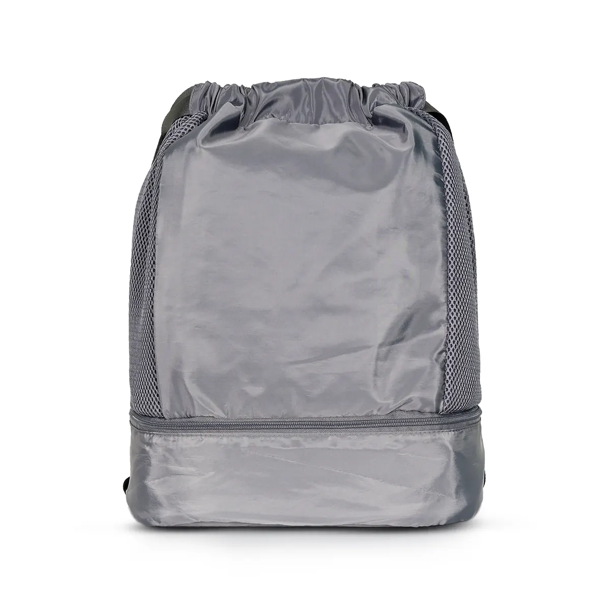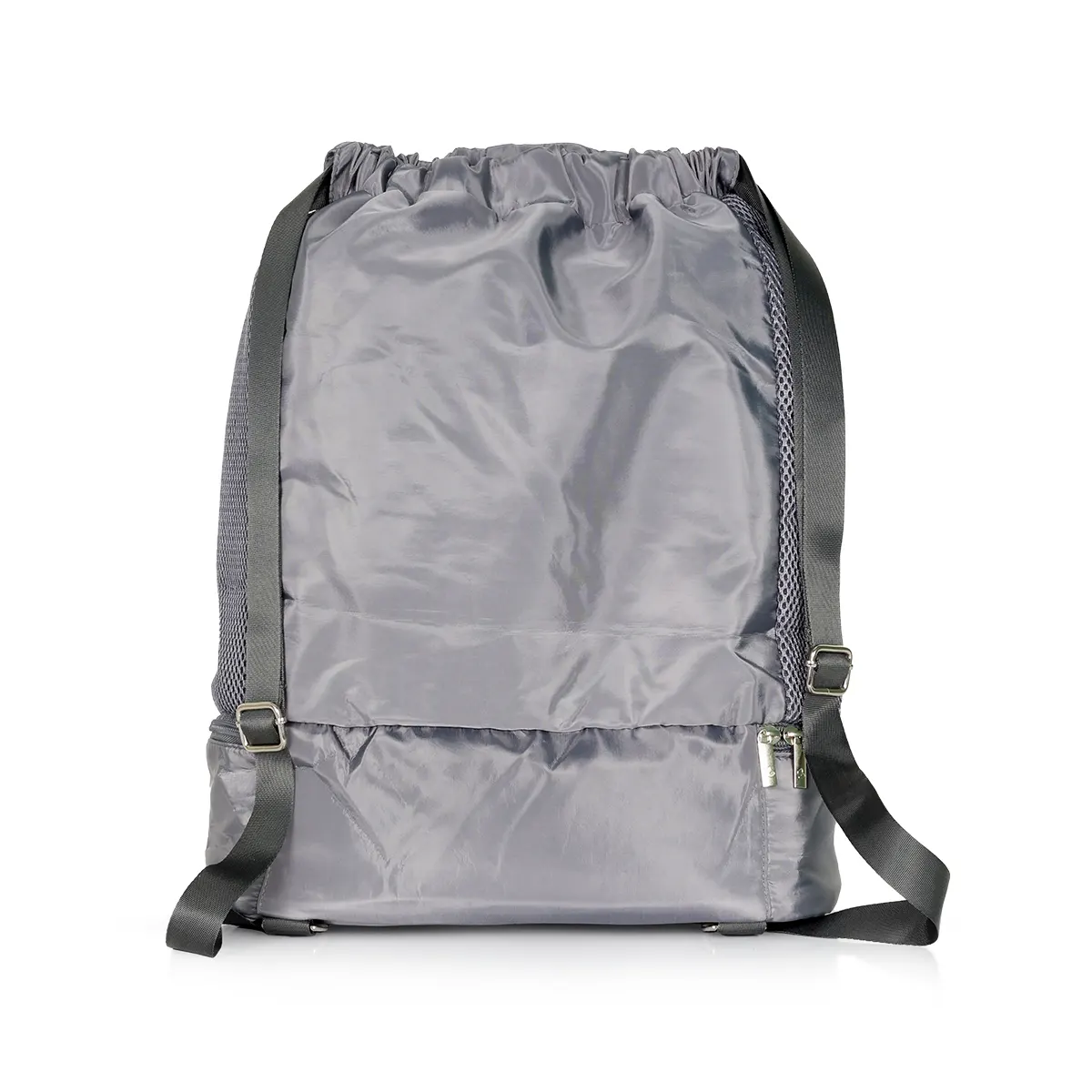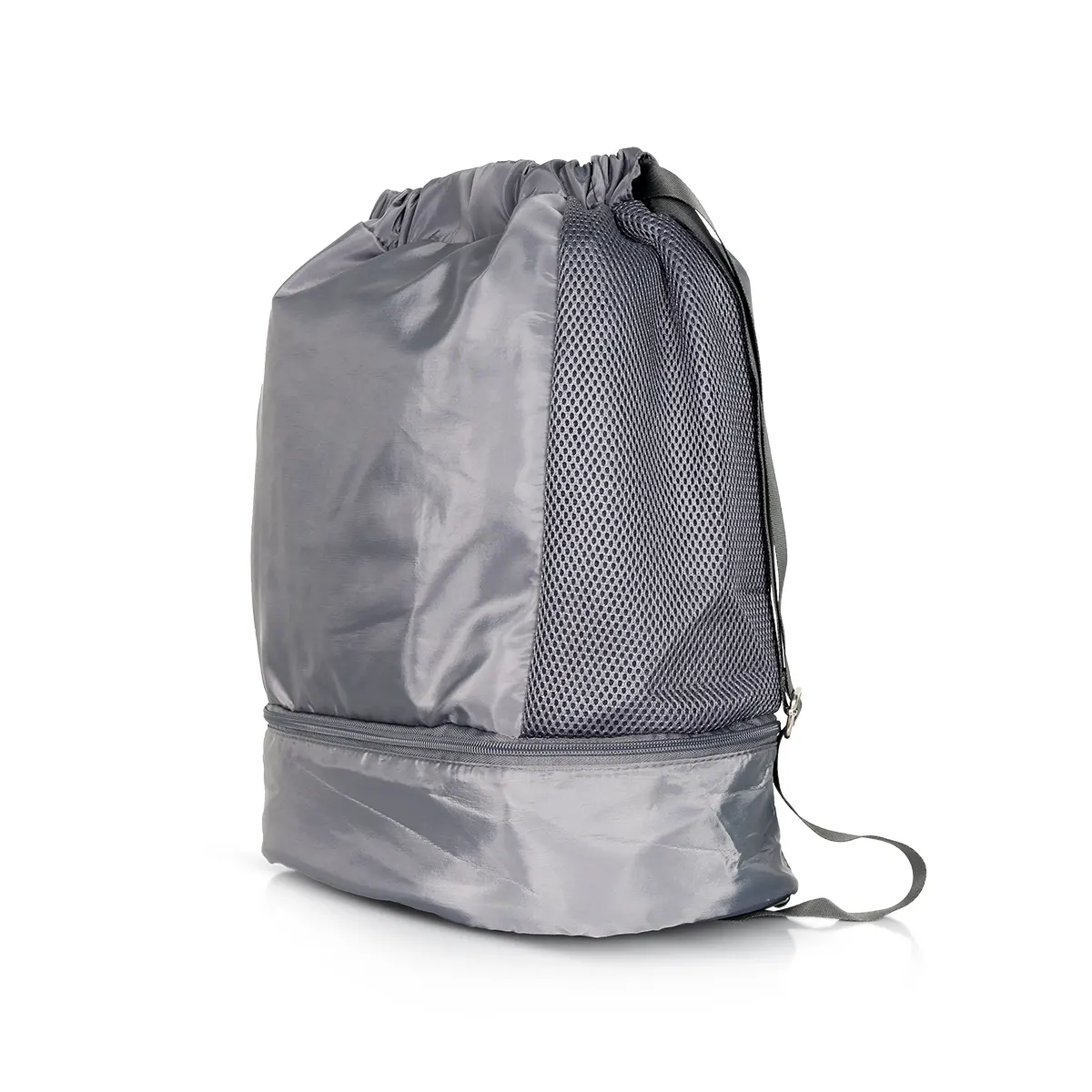 Sleek, practical, and built for everyday convenience — this Grey Drawstring Backpack from Green Bags UAE combines functionality with modern style. Crafted from durable, water-resistant polyester, it features a dual-compartment design with a spacious drawstring main section and a bottom zipper pocket perfect for shoes, accessories, or event materials.