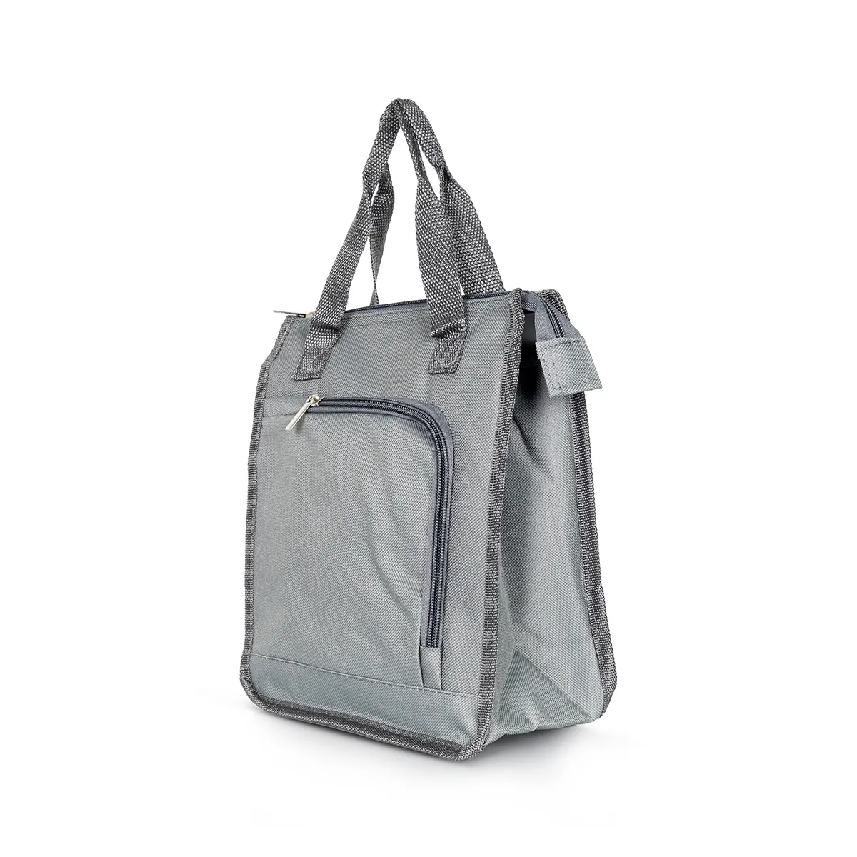 Keep your meals fresh and stylish with our grey vertical insulated lunch bag, crafted from premium polyester fabric for durability and elegance. Featuring a tall, compact design, this eco-friendly bag includes a front curved zipper pocket and sturdy top handles for easy carrying. The insulated interior maintains your food’s temperature, making it ideal for work, school, or travel.